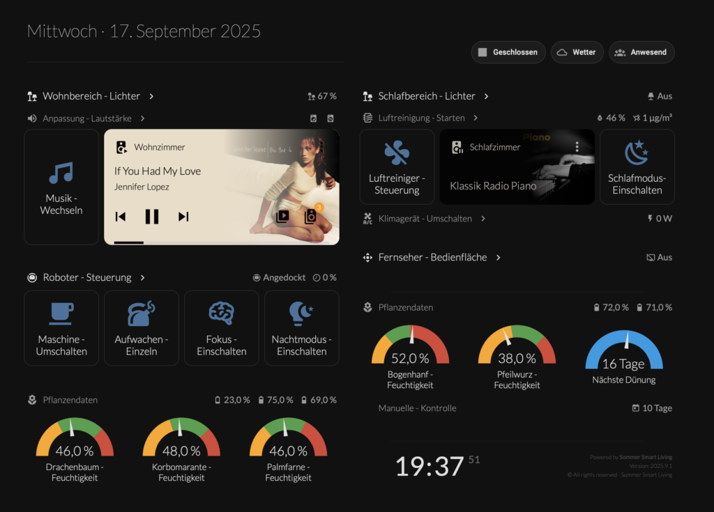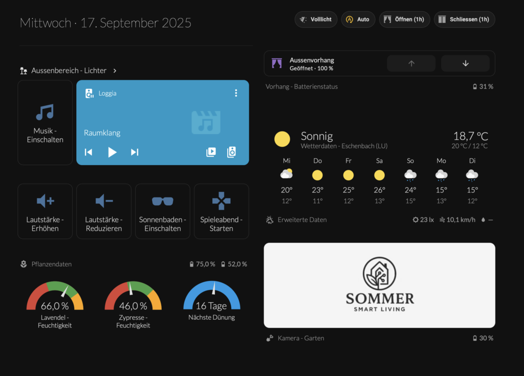 Bestehende Funktionen wurden sauber zusammengeführt und in einer zentralen Oberfläche strukturiert. Wichtige Alltagssituationen wie Ankommen, Abwesenheit oder Abend lassen sich dadurch einfacher steuern.